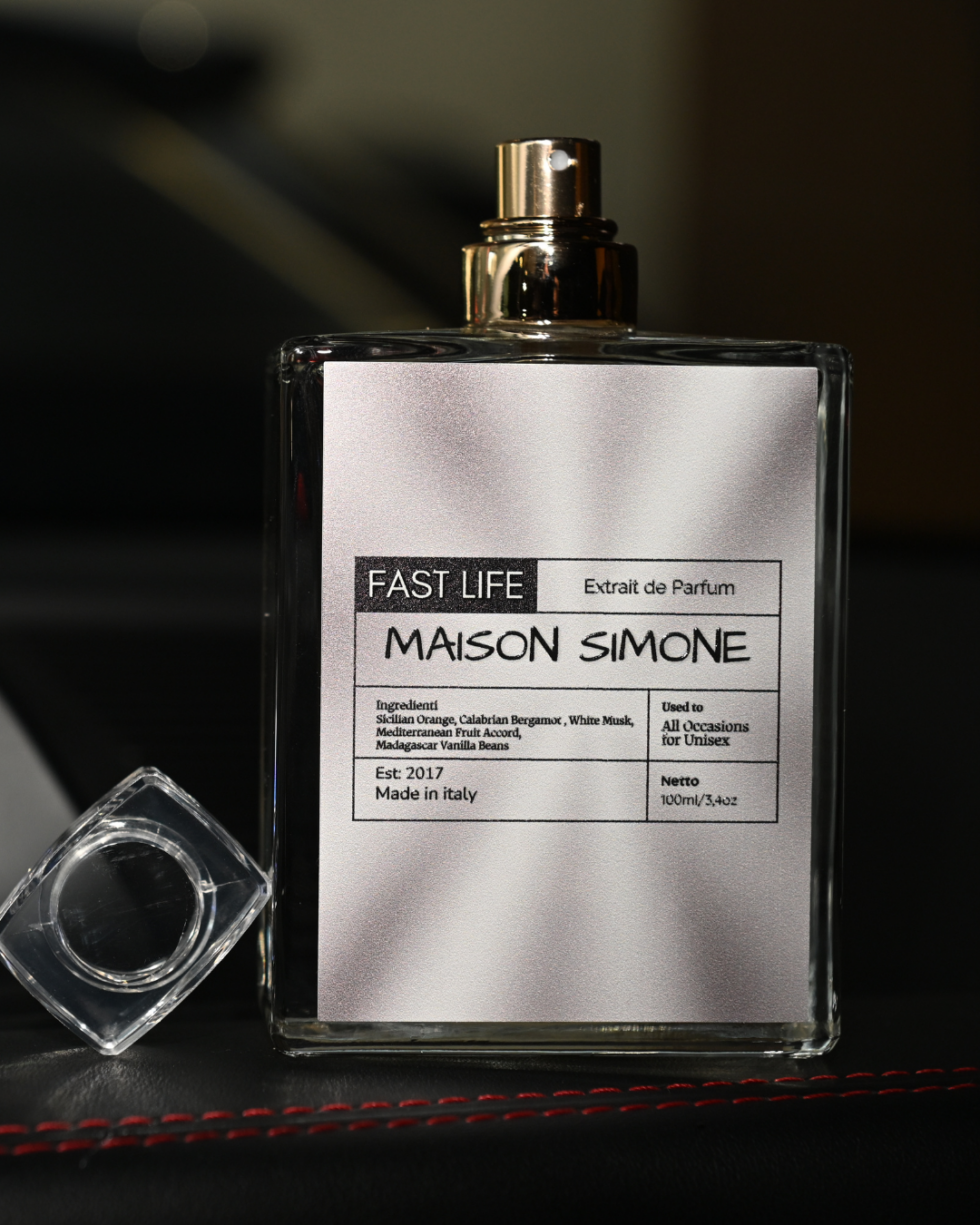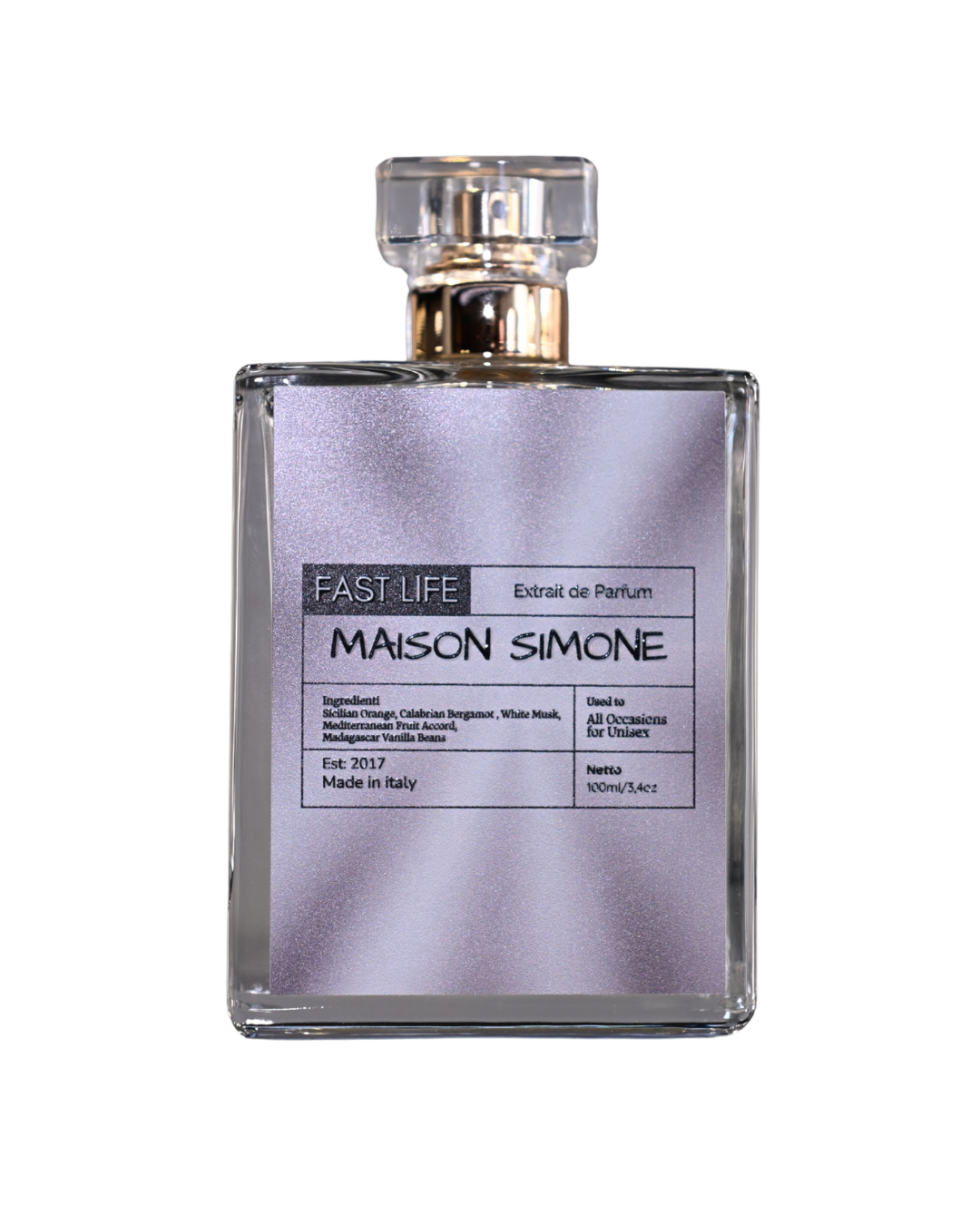 Fast Life di Maison Simone è un’esplosione gioiosa con l’incantevole Arancia di Sicilia, la vivacità del Limone, il pregiato Bergamotto calabrese che si offrono all’olfatto come una cesta di frutti, colorati e succosi, rinforzati dall’accordo fruttato mediterraneo,