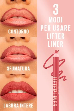 Scopri Lifter Liner, la nuova matita labbra di Maybelline NY per un colore a lunga tenuta. Con la sua formula arrichita con acido ialuronico e olio di jojoba, dona idratazione con una texture cremosa e confortevole. Questa matita labbra è facile da applicare ed è disponibile in 8 tonalità da abbinare con il tuo Lifter Gloss, Vinyl Ink o Superstay Matt Ink preferito.